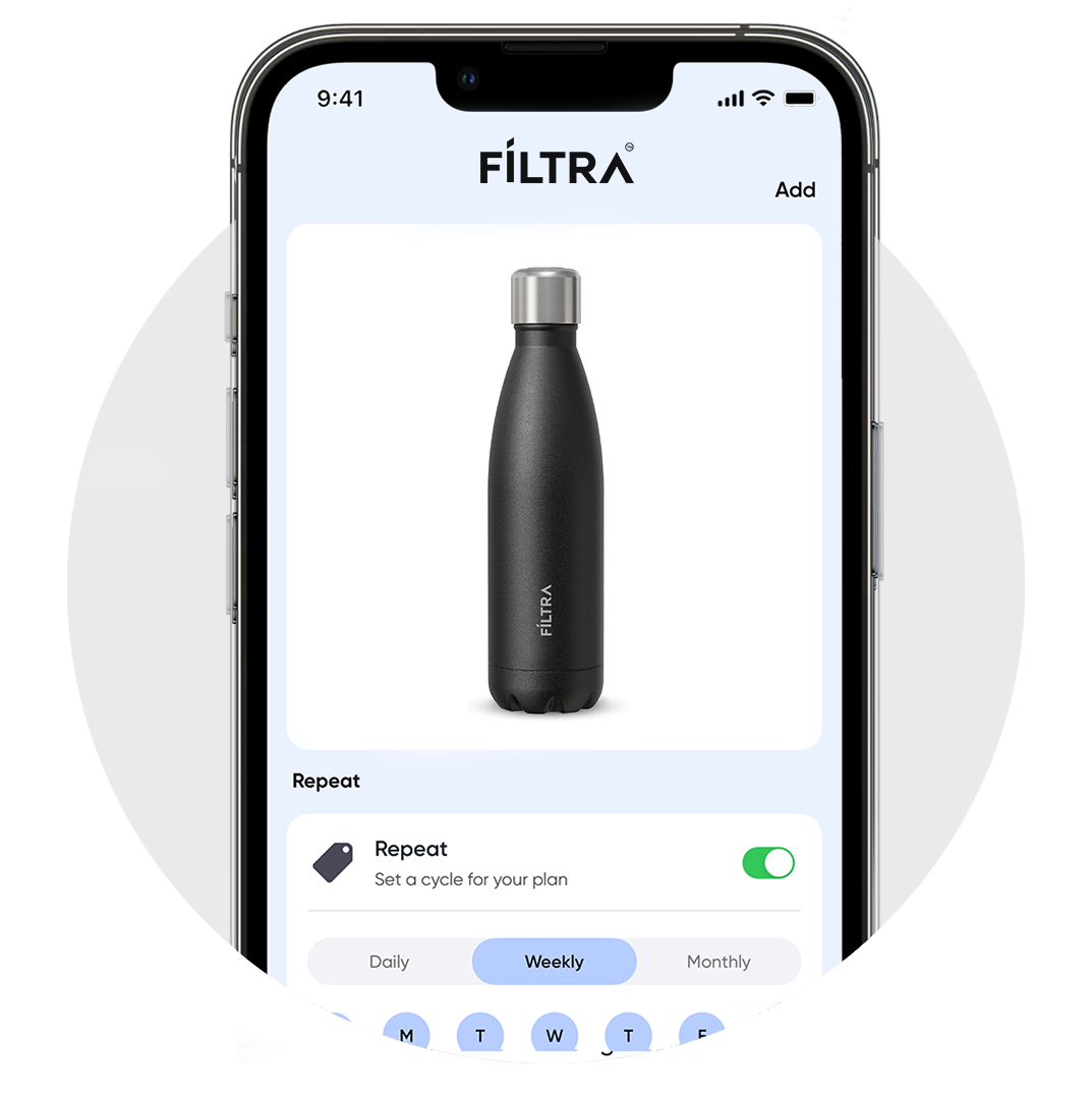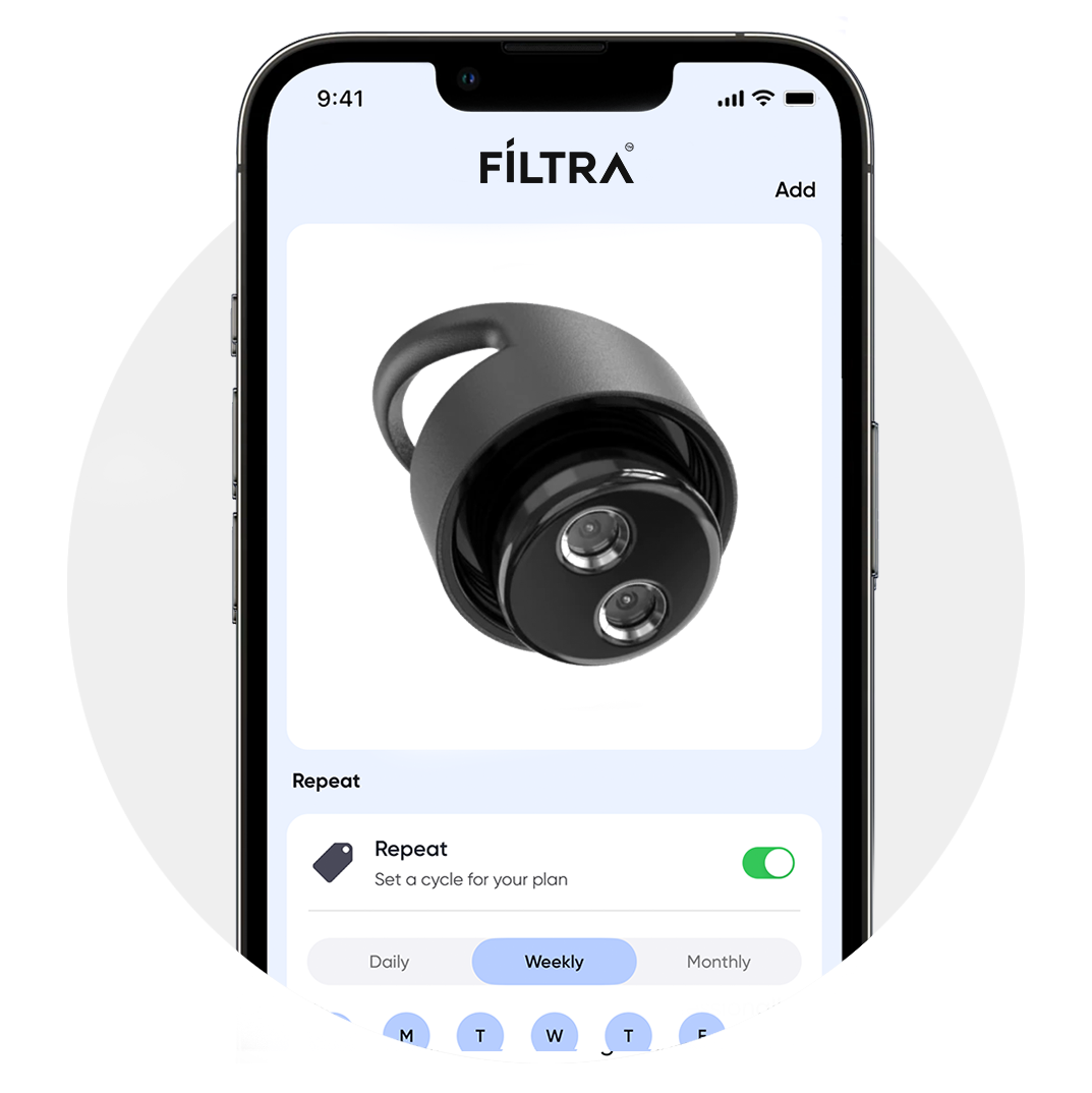 The Filtra Smart-Bottle™ is the world's first self-cleaning water bottle on monthly subscription. It uses UV technology to eliminate up to 99%* of bio-contaminants.